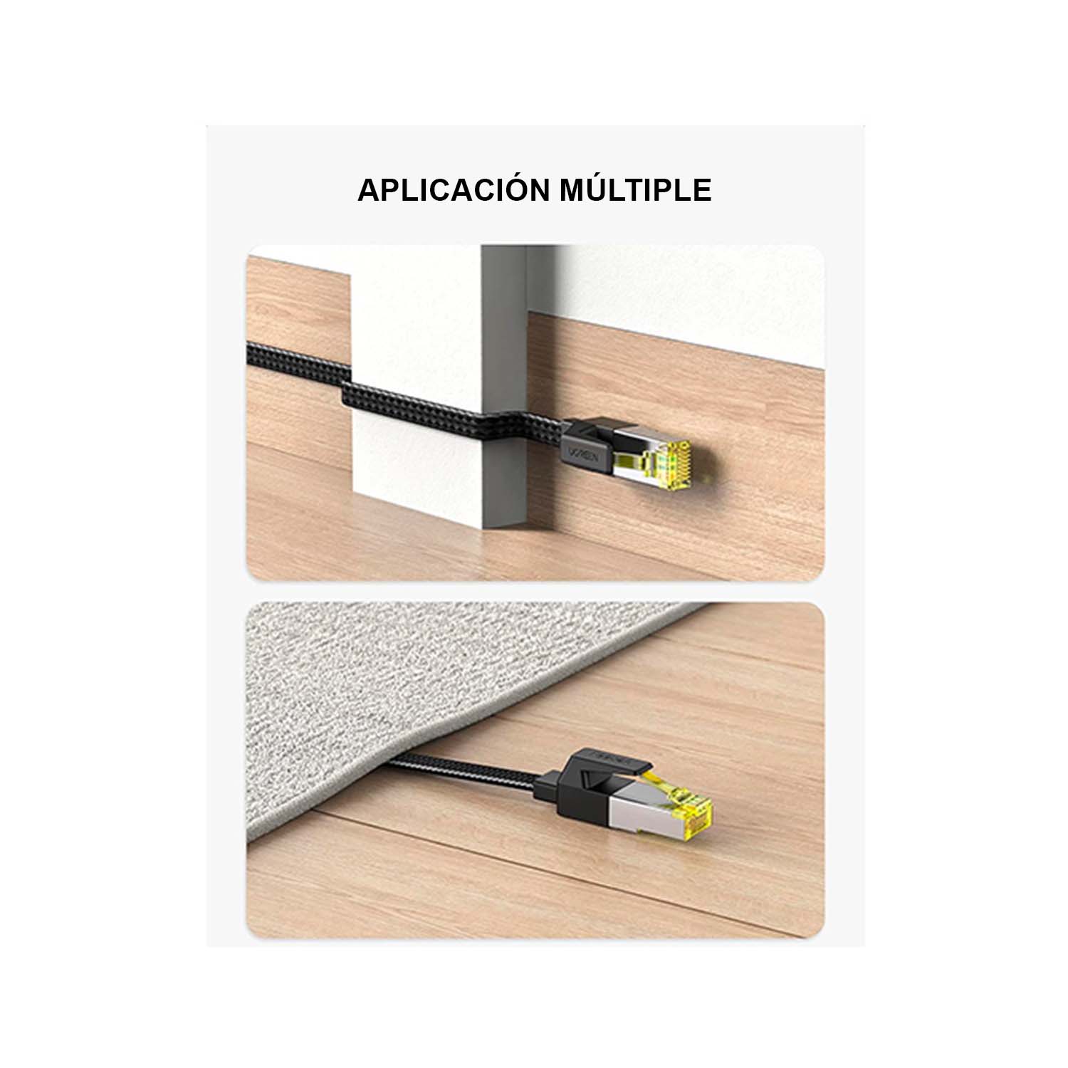 El cable Ethernet plano UGREEN Cat 7 adopta un diseño plano y delgado único, que permite una instalación más limpia y segura. Ya sea que quieras instalarlo debajo de la puerta, a través de la ventana o escondido debajo de la alfombra, puedes hacerlo muy fácilmente. Es muy adecuado para cableado interior.