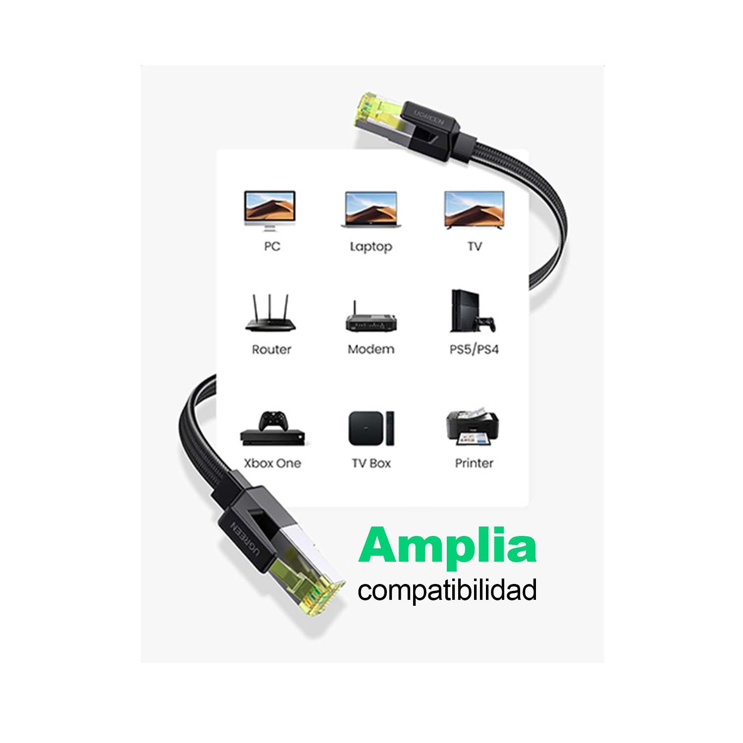 Ethernet Este cable Cat 7 de alta velocidad no solo es compatible con cables Cat6, Cat5, Cat5e, sino que también funciona bien con todos los dispositivos con conector RJ45 como iMac Pro, PS3, PS4, PS4 Pro, PS5, Smart TV, Sky Q box, extensor WiFi, Switch, TP-Link, consolas de videojuegos, Raspberry Pi 4, decodificador de TV, enrutador WiFi, PC, impresoras de red, reproductores multimedia, TV box, NAS, teléfonos VoIP, Freebox, Livebox, BT Smart Hub, módem Virgin, panel de conexión, reproductor de Blu-ray, etc.