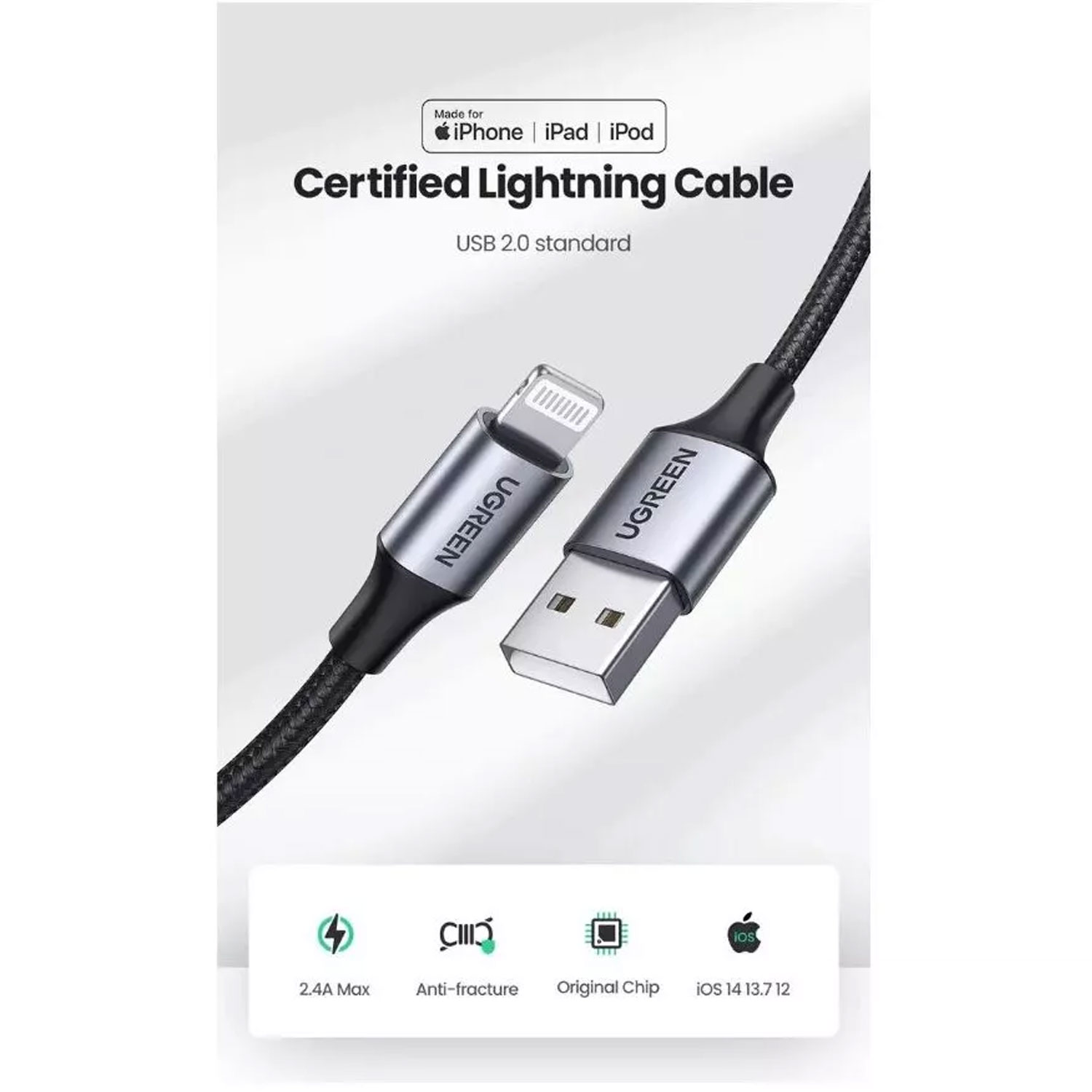 El cable UGREEN Lightning a USB está diseñado para ofrecer carga estable y transferencia de datos confiable para dispositivos Apple. Su construcción con cubierta trenzada y carcasa de aluminio brinda mayor resistencia al uso diario, ideal para hogar, oficina o transporte frecuente.