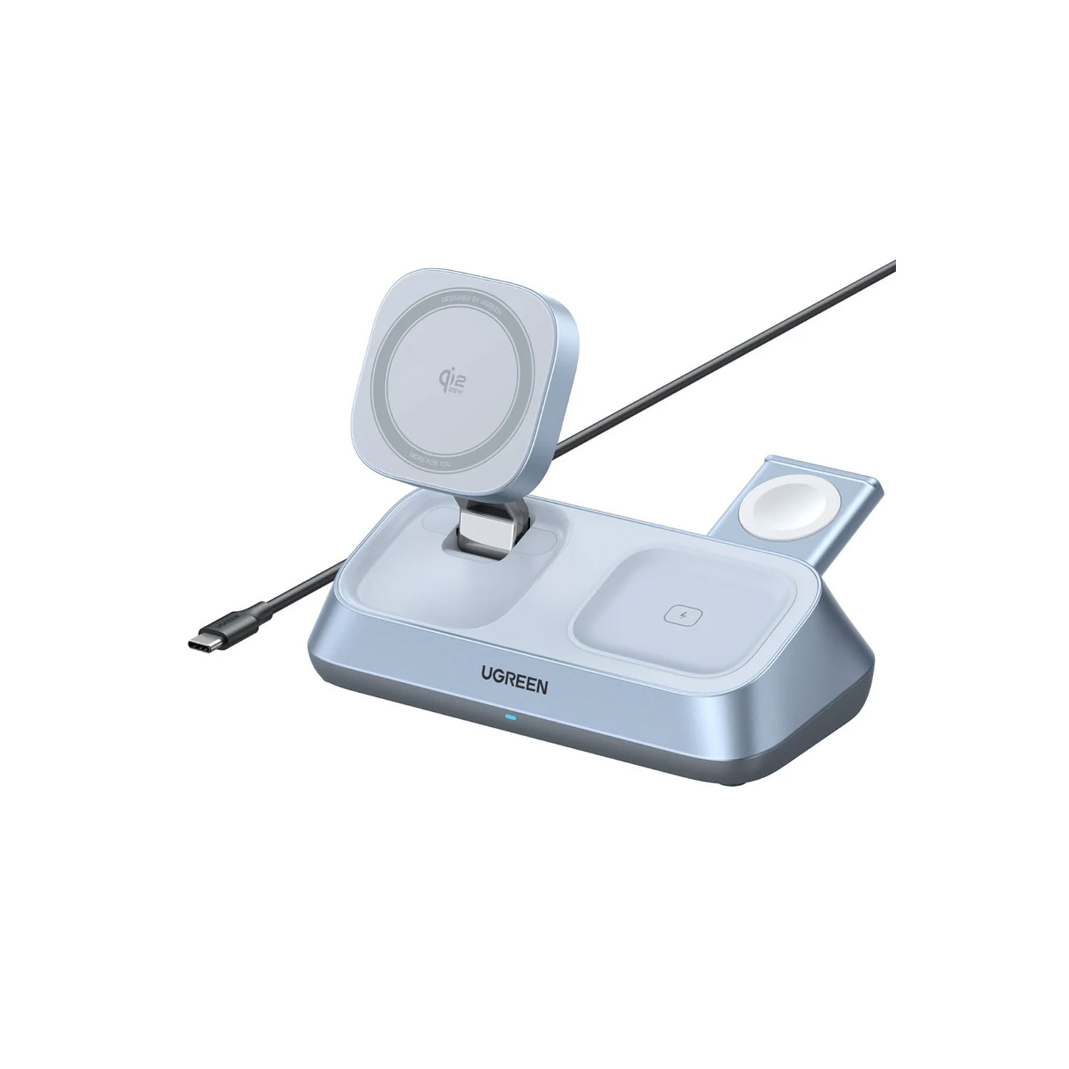 Incluye una base ajustable para reloj inteligente que soporta carga rápida para modelos Apple Watch y compatibles. Además, cuenta con un módulo de carga Qi para audífonos inalámbricos de hasta 5W.