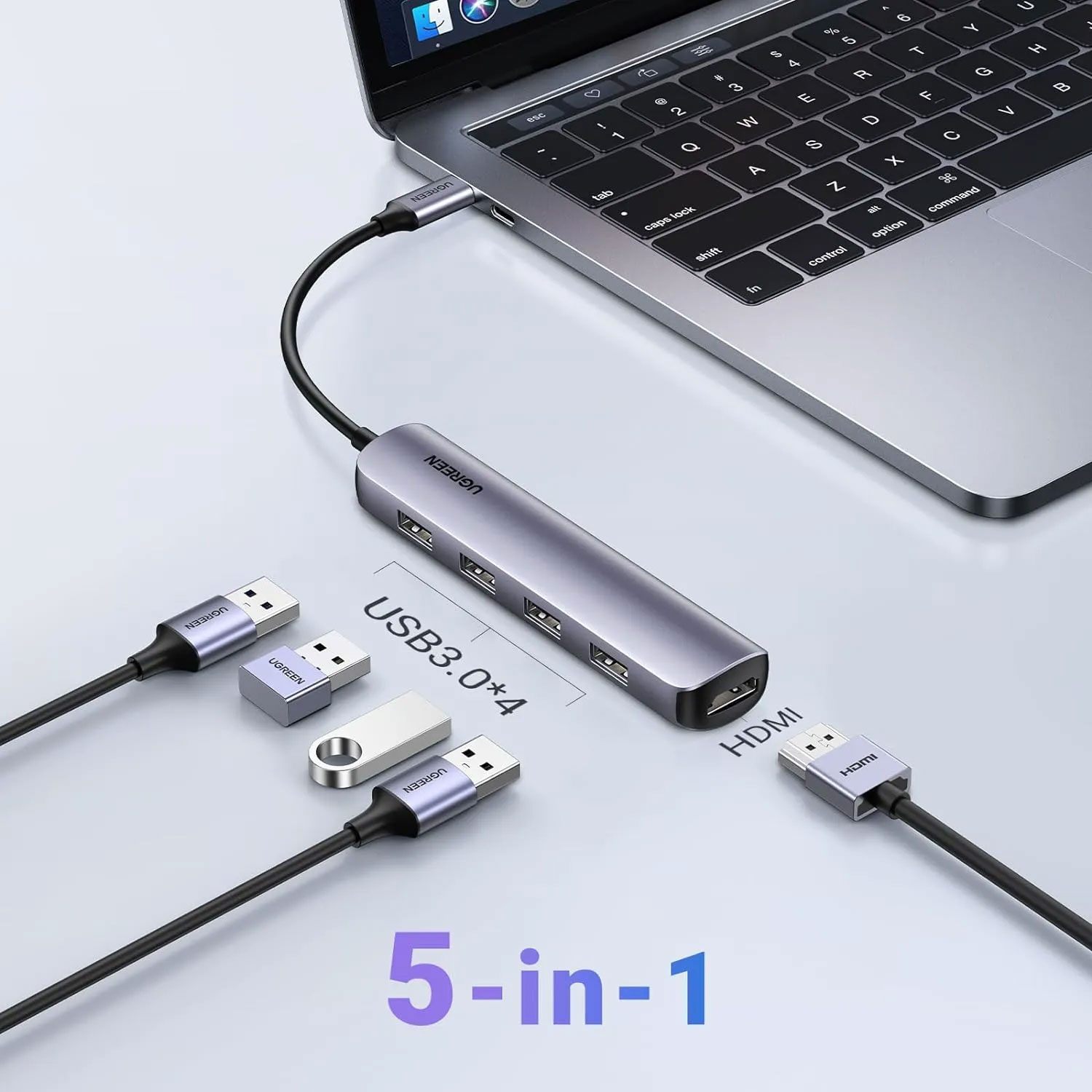 El adaptador UGREEN USB-C permite expandir la conectividad de laptops y dispositivos USB-C, ofreciendo cuatro puertos USB 3.0 y salida HDMI para video en alta definición. Ideal para trabajo, gaming y productividad, combina versatilidad y facilidad de uso en un diseño compacto.