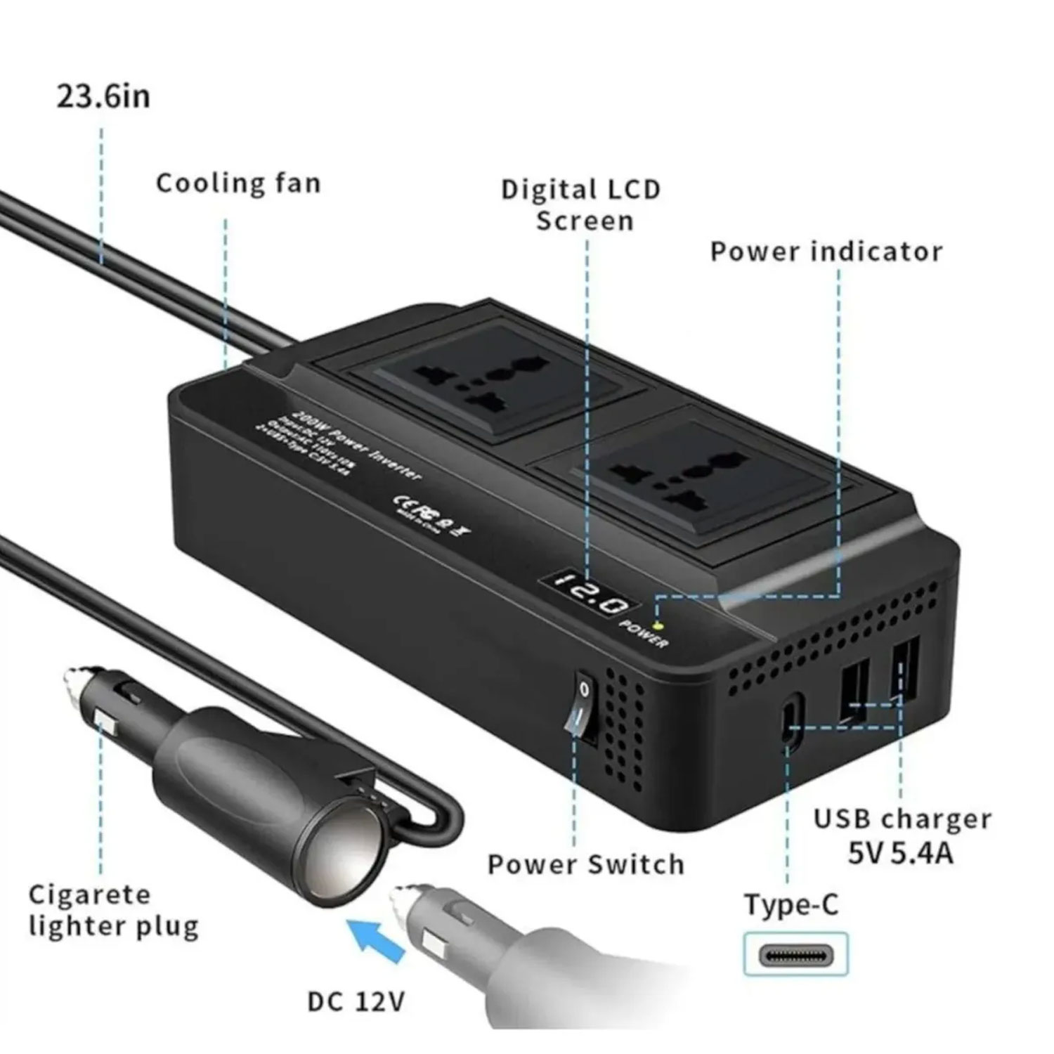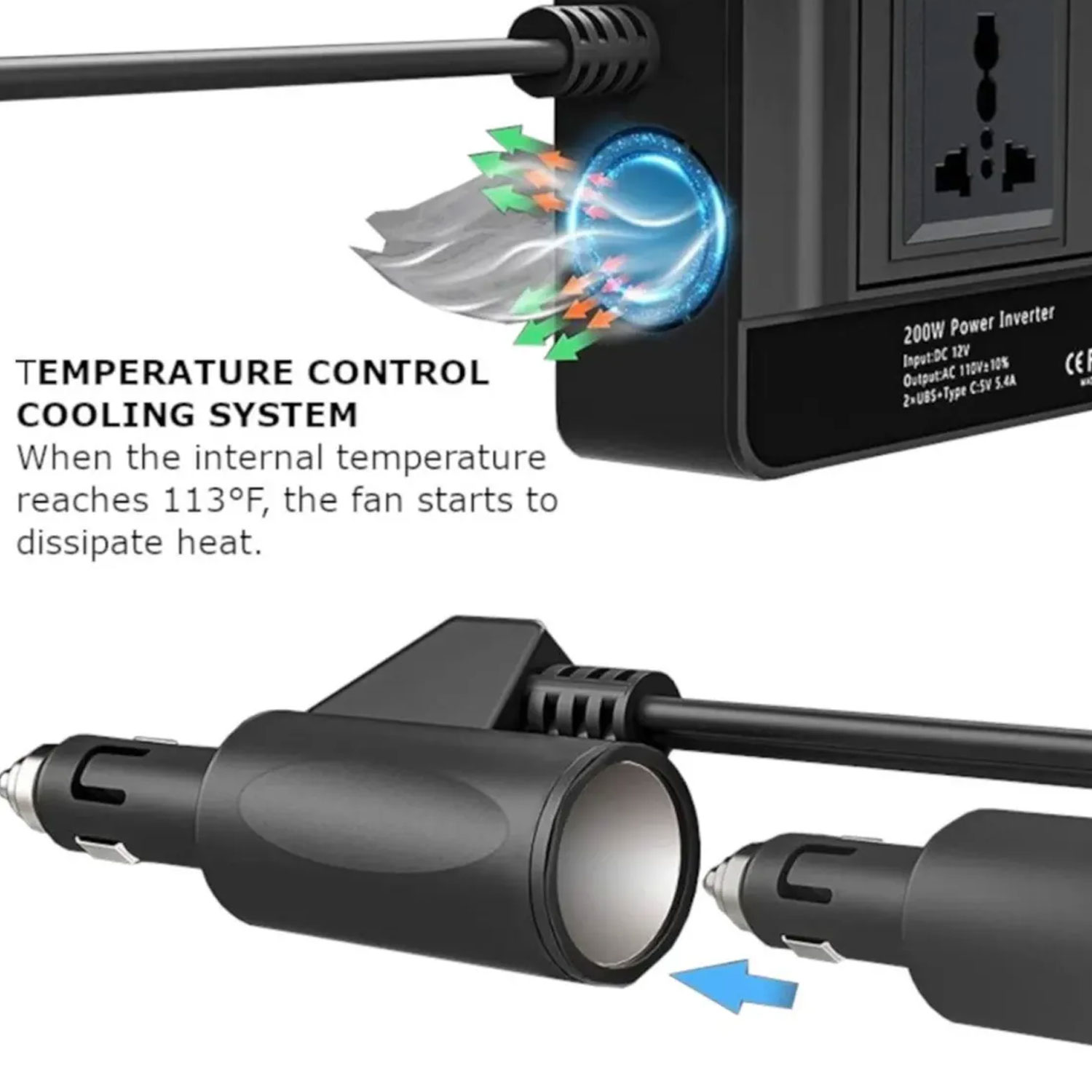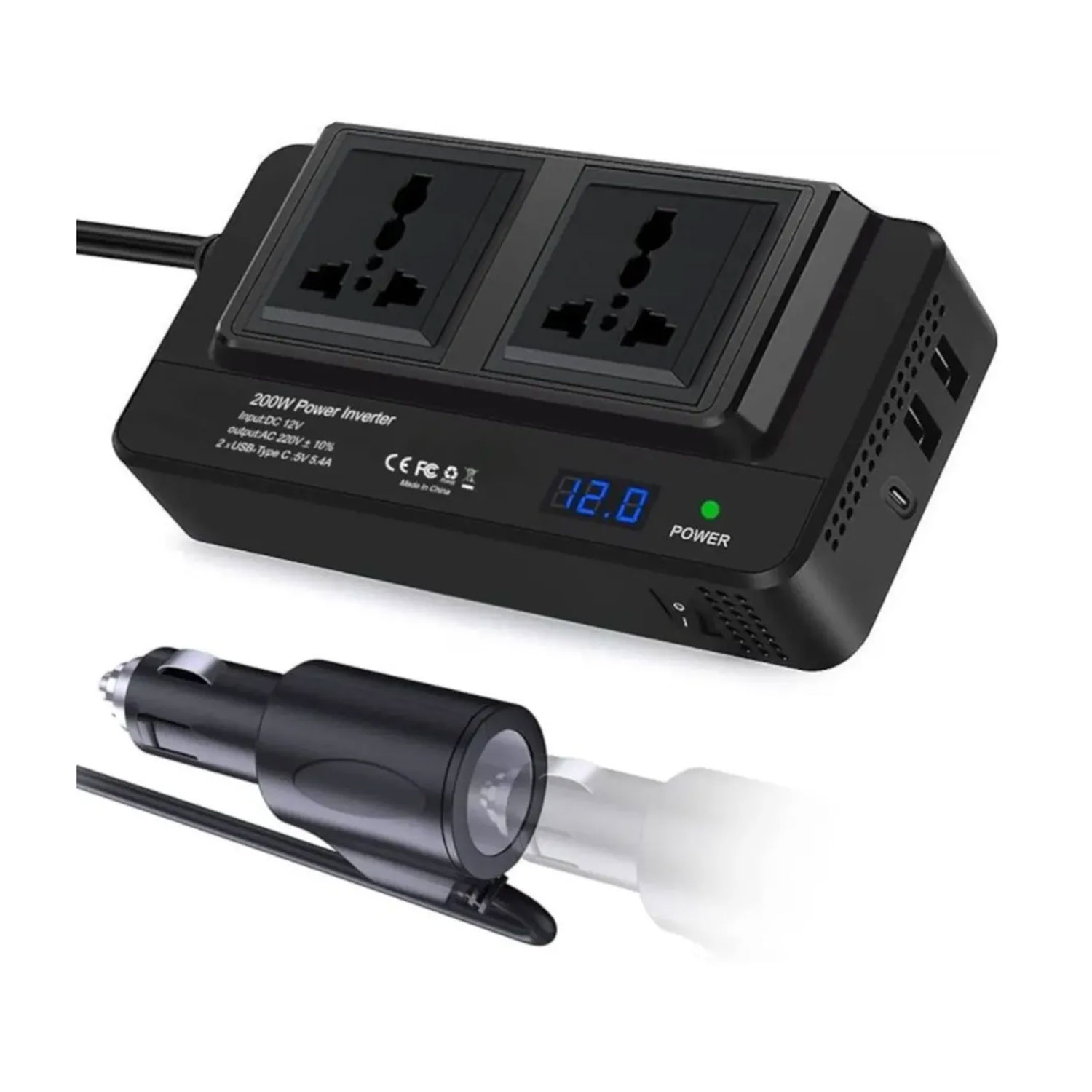 Convierte la corriente continua del vehículo (12V/24V) a corriente alterna de 110V-220V con una potencia máxima de 200W, suficiente para alimentar pequeños electrodomésticos, laptops, consolas portátiles o herramientas de baja demanda.