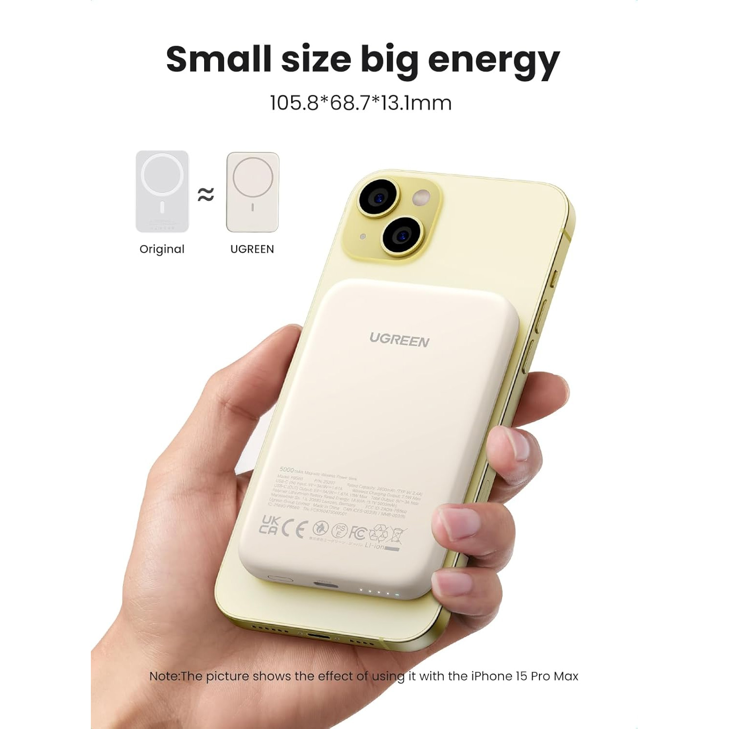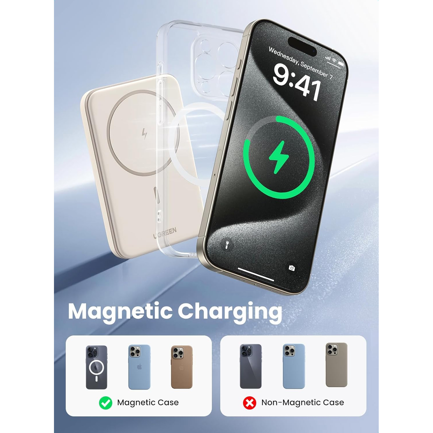 El Power Bank UGREEN PB560 modelo 25866 posee un diseño magnético tipo MagSafe que se adhiere firmemente a la parte trasera del iPhone, ofreciendo una carga segura y sin deslizamientos.