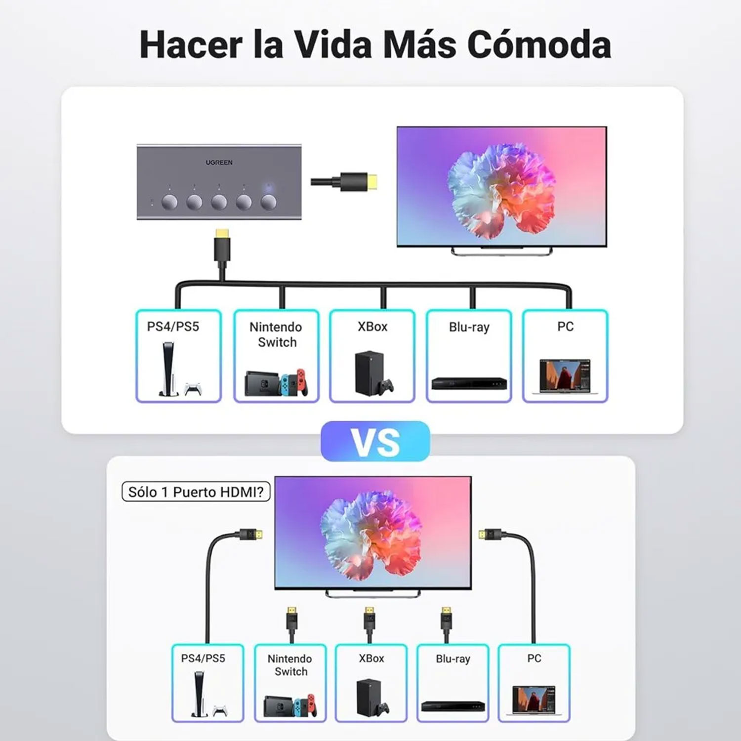 El switch HDMI UGREEN CM568 permite conectar hasta cinco dispositivos a una sola pantalla, facilitando el cambio rápido entre consolas, reproductores, laptops y más. Ideal para setups domésticos o profesionales donde se requiere gestión eficiente de múltiples fuentes.