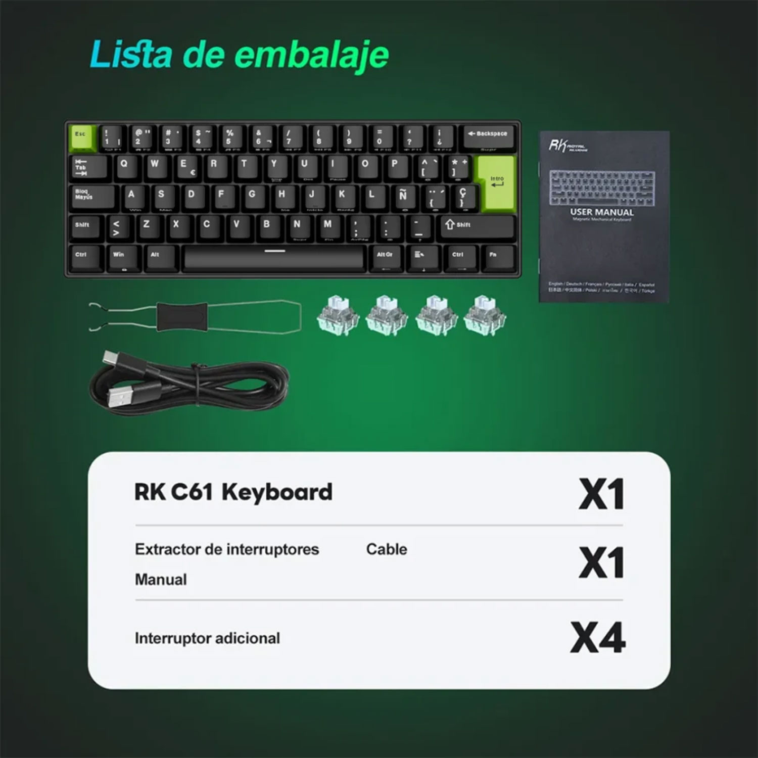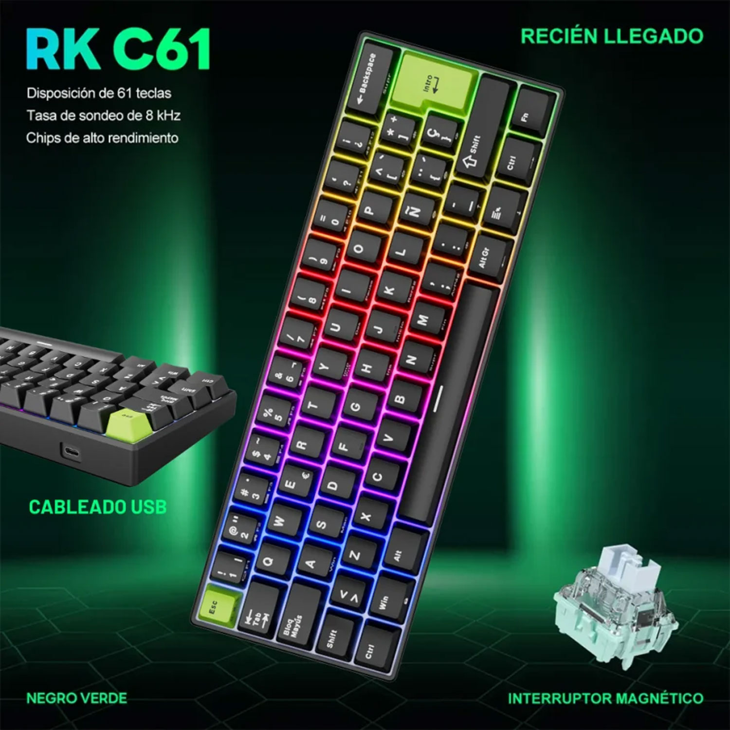 Teclado Gamer Royal Kludge Rk C61 Cableado Español Black Green Mint Magnetic Switch