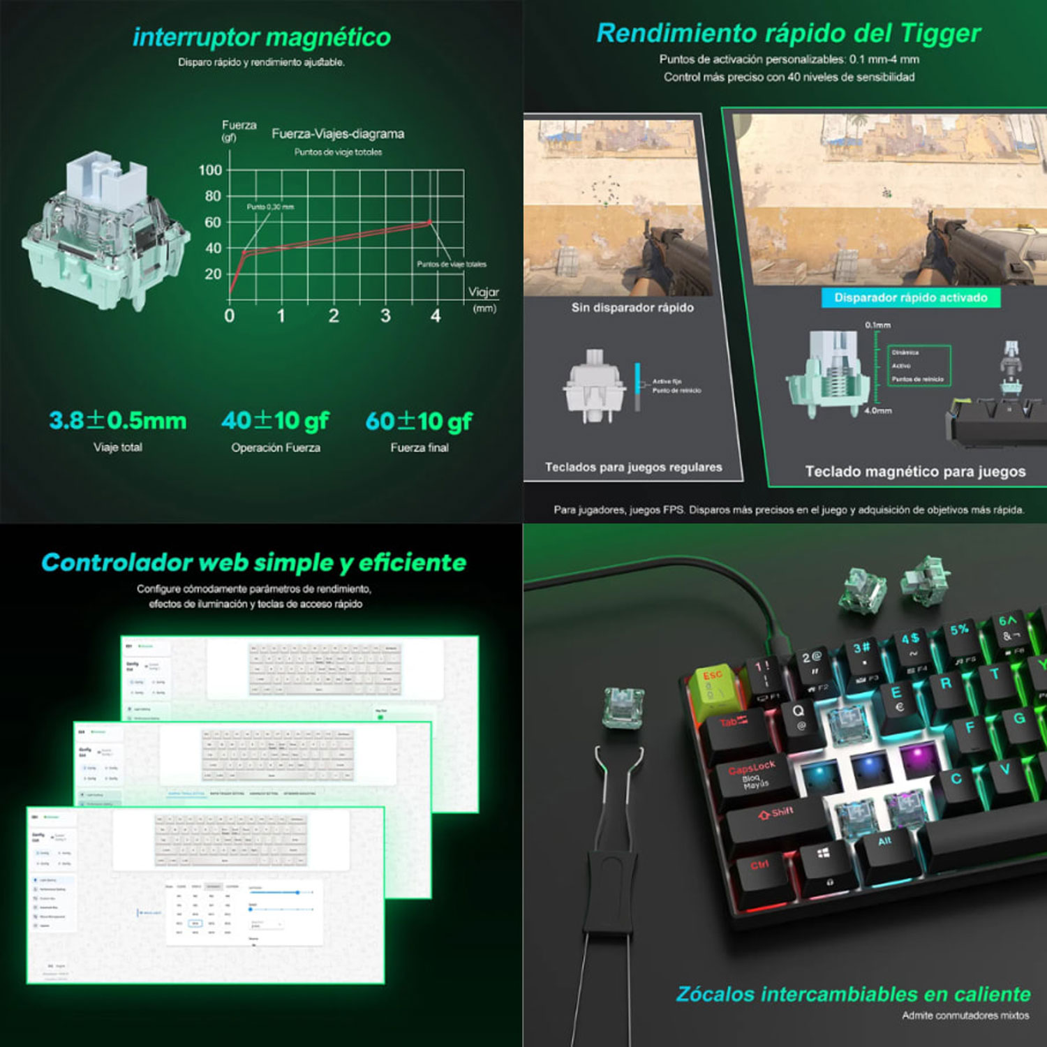 Utiliza interruptores magnéticos lineales Green Mint que activan por detección de campo magnético, ofreciendo tiempos de respuesta ultra rápidos, durabilidad de hasta 100 millones de pulsaciones y un sonido suave sin vibración táctil.