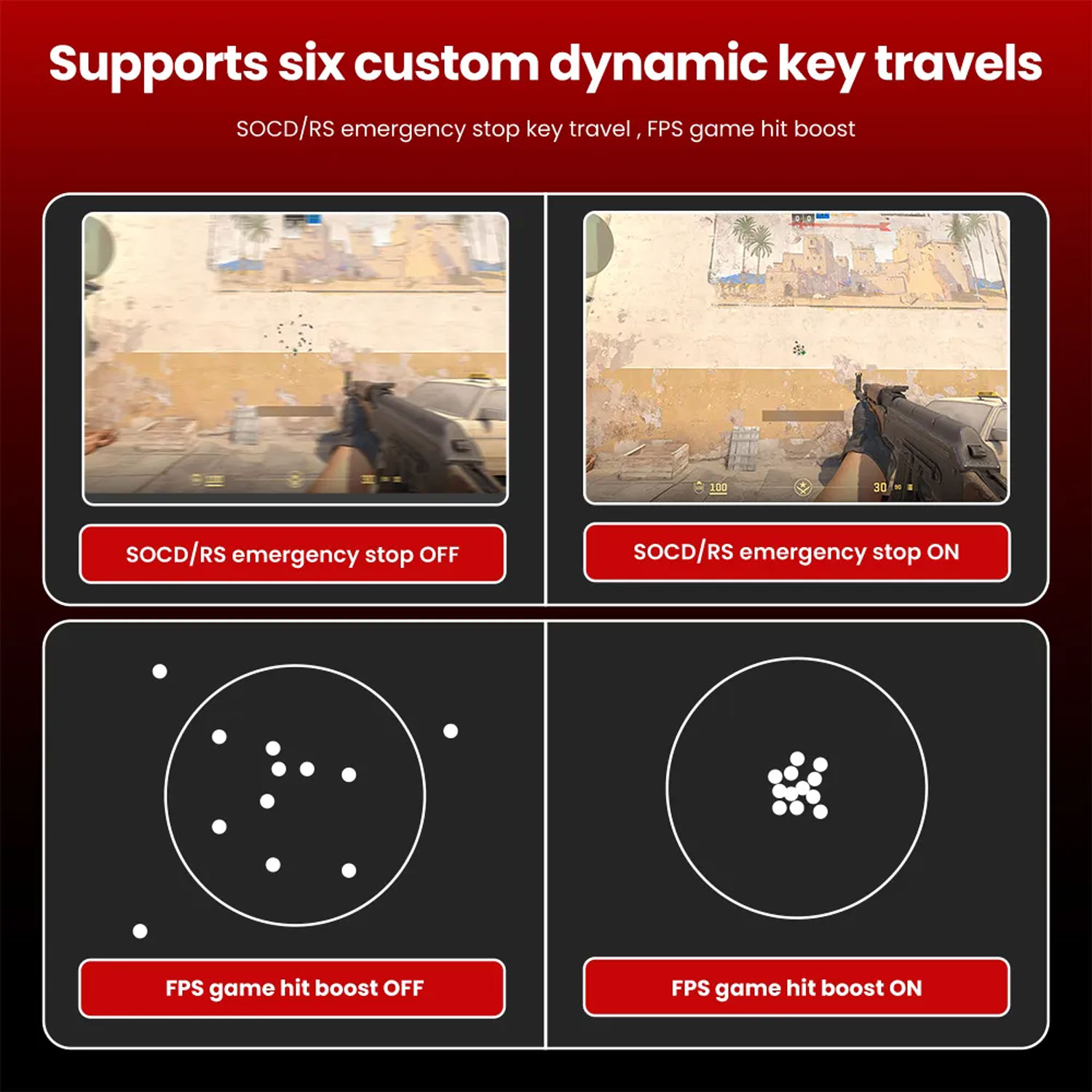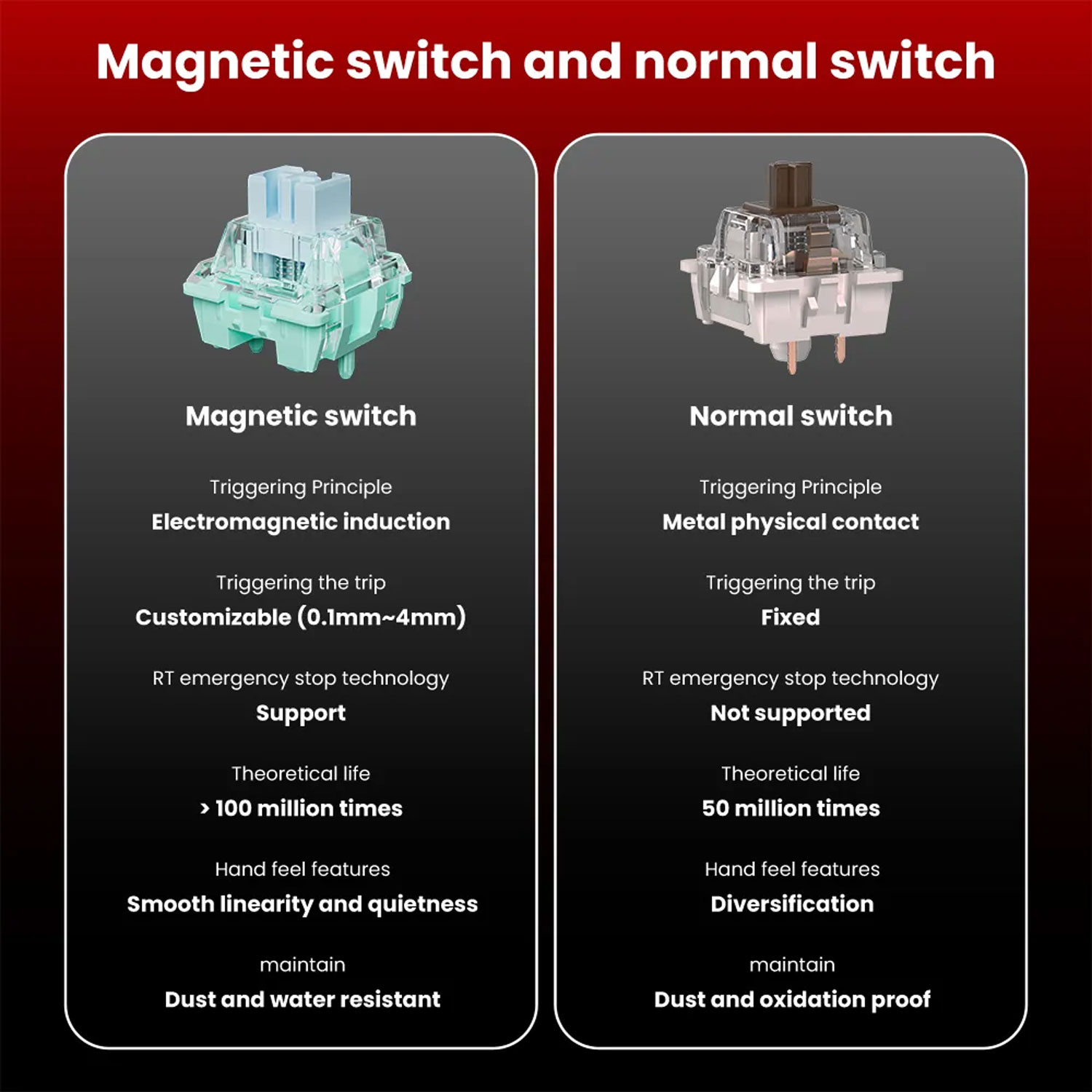 Utiliza interruptores magnéticos lineales Mint que activan por detección de campo magnético, ofreciendo tiempos de respuesta ultra rápidos (=0.2 ms), durabilidad de 100 millones de pulsaciones y un recorrido suave sin vibración táctil.